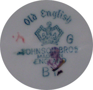 The production period is easily determined by the BY printed just below the backstamps on the underside - this was a coding used by Johnson Bros. during the "Wartime Concentration" period when the British Government placed heavy restrictions upon homewares manufacturers due to the focus on the War effort.
